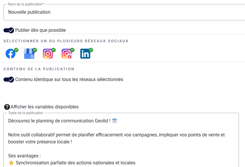 Le gain de temps est également important pour vos équipes locales. Ces équipes n’ont pas forcément beaucoup de temps à consacrer à l’animation de leurs réseaux sociaux ou à la gestion de leurs campagnes publicitaires par exemple. Avec une plateforme de marketing local et grâce à la mise à disposition d’éléments de communication prêt à l’emploi, ils n’ont plus qu’à cliquer sur publier.