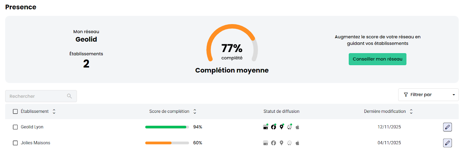 - Le presence management afin d’optimiser la visibilité de vos établissements sur les principaux annuaires, sites d’avis et GPS.
